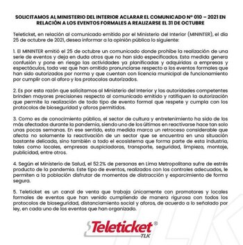 “Solicitamos al Ministerio del Interior y las autoridades competentes brinden mayores precisiones respecto al comunicado y ratifiquen la autorización que permite la realización de todo tipo de evento formal que respete y cumpla con los protocolos de bioseguridad y aforos permitidos”, señala la empresa de emisión de tickets.