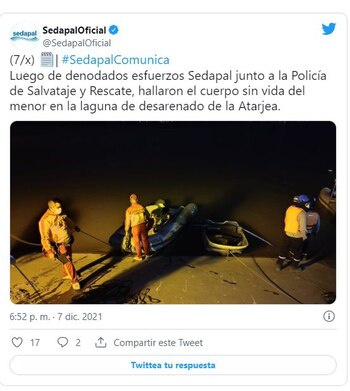 Sedapal, mediante su cuenta Twitter, lamentó el deceso del menor e informó que el equipo de bienestar social de la empresa está acompañando a la familia del niño, a quién “brindará la asistencia y apoyo social para su traslado a la ciudad de Tarma.