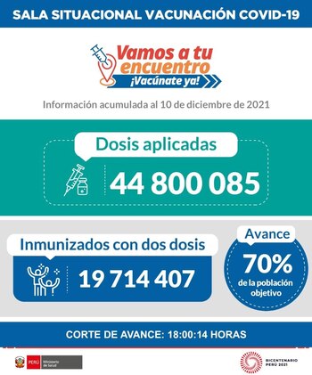 Hasta ayer, viernes 10 de diciembre, el Minsa había aplicado 44 millones 517,892 dosis, por lo que en las últimas 24 horas colocó 282,193 más.