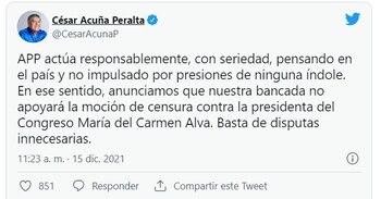 “APP actúa responsablemente, con seriedad, pensando en el país y no impulsado por presiones de ninguna índole. En ese sentido, anunciamos que nuestra bancada no apoyará la moción de censura contra la presidenta del Congreso María del Carmen Alva. Basta de disputas innecesarias”, expresó Acuña en su cuenta de Twitter.