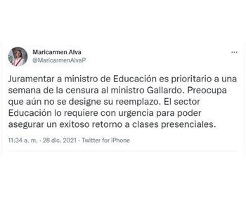 “Juramentar a ministro de Educación es prioritario a una semana de la censura al ministro Gallardo. Preocupa que aún no se designe su reemplazo. El sector Educación lo requiere con urgencia para poder asegurar un exitoso retorno a clases presenciales”, sostuvo, Alva.