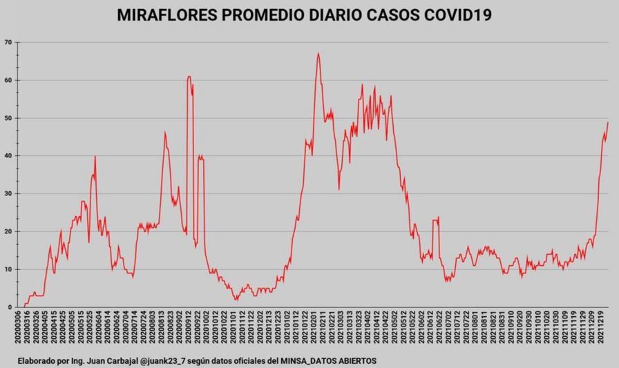 Según el especialista los casos en Miraflores y Magdalena del Mar se han triplicado en tan solo una semana y en el caso de La Molina, San Isidro, Santiago de Surco y San Borja los casos se han duplicado. Si nos referimos a todo Lima Metropolitana tenemos que los casos han aumentado en un 25% desde la llegada de la variante más contagiosa hasta el momento y es ómicron.