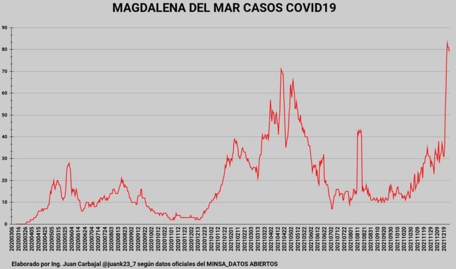 Durante la semana del 17 de diciembre los casos en Magdalena del Mar eran de 35 en total, pero durante la semana de Navidad (24 de diciembre), los casos aumentaron a 82 positivos, casi triplicando el total de lo que se registraba una semana antes. Estos son solo los casos identificados porque se les han realizado una prueba de descarte; sin embargo, la cantidad podría aumentar, debido a que hay muchas personas que no se realizan exámenes de descarte para COVID-19. Este aumento rápido es una de las características de ómicron, ya que es una variable con alta tasa de transmisibilidad.