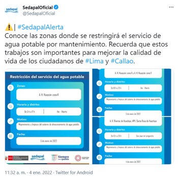 El Servicio de Agua Potable y Alcantarillado de Lima (Sedapal) informó que este miércoles 5 de enero se registrará un corte de agua en Ate, por el trabajo de mejoramiento en el sistema de agua potable.