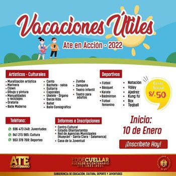 Llegó el verano y las vacaciones para los estudiantes también. Es por eso que diversas instituciones han habilitado talleres y cursos para que los pequeños potencien sus habilidades y descubran nuevos talentos ocultos y la Municipalidad de Ate ya habilitó talleres deportivos y artísticos para todos los que quieran aprovechar el verano 2022.