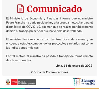 A través de un comunicado, el ministerio de Economía y Finanzas, anunció que el titular de esa cartera, Pedro Francke, dio positivo a la prueba molecular para el diagnóstico de COVID-19 que se realizó este martes 11 de enero.