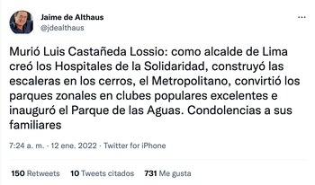 Por otro lado, el periodista y escritor Jaime de Althaus, quien resaltó las obras que él ex burgomaestre había realizado en sus años al mando del sillón municipal.