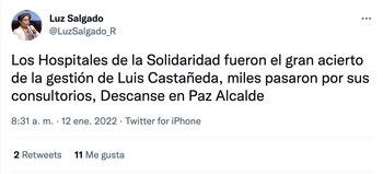 Luz Salgado, ex presidenta del Congreso y fujimorista, resaltó el gran acierto que tuvo Castañeda en los Hospitales de la Solidaridad.