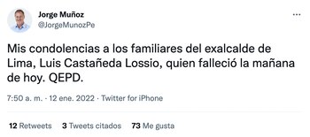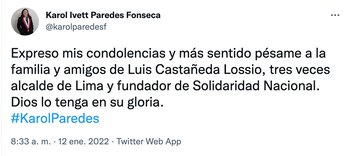 La actual congresista del partido Acción Popular, Karol Paredes, también expresó sus condolencias con el exburgomaestre.