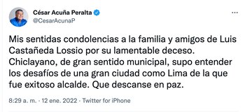 El actual denunciante de Christopher Acosta, César Acuña también mandó sus condolencias para la familia de Castañeda Lossio.