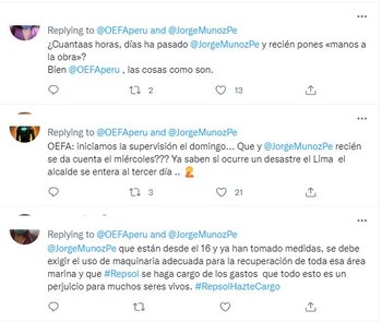 “Buenas tardes, Jorge Muñoz, en relación al derrame ocurrido en Ventanilla debemos precisar que iniciamos la supervisión el domingo 16 de enero y hemos dictado las siguientes medidas administrativas de cumplimiento inmediato”, respondió OEFA también a través de Twitter.