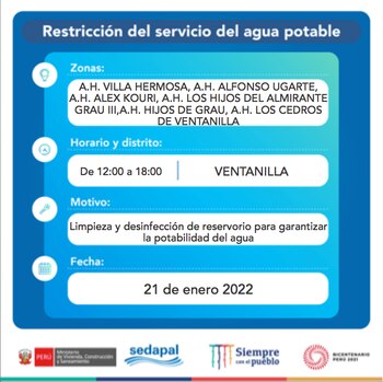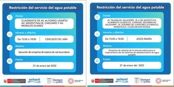 El Servicio de Agua Potable y Alcantarillado de Lima (Sedapal) informó que este 21 de enero se registrará un corte de agua en Jesús María, Cercado de Lima y Ventanilla, por el trabajo de mejoramiento en el sistema de agua potable.