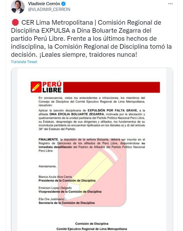 Por su parte, Vladimir Cerrón, secretario general de Perú Libre, compartió el anuncio de la expulsión de Dina Boluarte del partido y agregó el siguiente mensaje: “¡Leales siempre, traidores nunca!”.