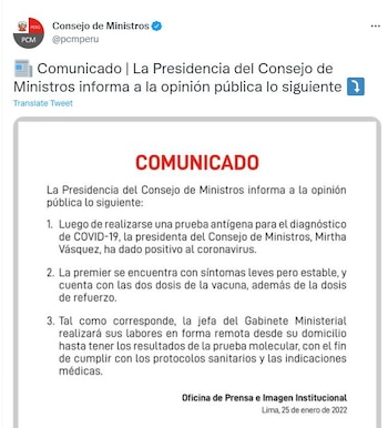 Un caso más de COVID-19 dentro del gabinete. La presidencia del Consejo de Ministros comunicó la tarde de este martes que la premier, Mirtha Vásquez Chuquilín, dio positivo para coronavirus, luego de realizarse un prueba antígena para el diagnóstico del SARS-CoV-2.