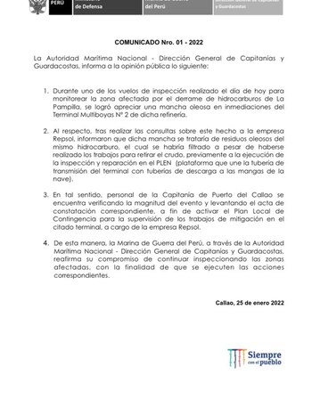 A horas de la mañana del 25 de enero, se difundió en redes sociales la noticia de un segundo derrame de petróleo y la Marina de Guerra, a través de la Dirección de Capitanías y Guardacostas del Perú, emitió un comunicado donde descarta esta posibilidad e indicó que seguirán con los trabajos de monitoreo en la zona afectada.