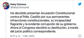 La congresista de Avanza País, Patricia Chirinos informó esta mañana, a través de su cuenta oficial de Twitter que presentará una acusación constitucional contra el presidente de la República, Pedro Castillo, “por sus permanentes infracciones constitucionales, su incapacidad flagrante y la evidente corrupción de su Gobierno”.