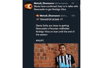 El periodista búlgaro Metodi Shumanov informó mediante su cuenta de Twitter que Rodrigo Vilca estaría muy cerca de Slavia Sofia y sería una cesión hasta el final de la temporada. Además, señaló que el presidente de los blancos había confirmado el interés por el mediocampista nacional.