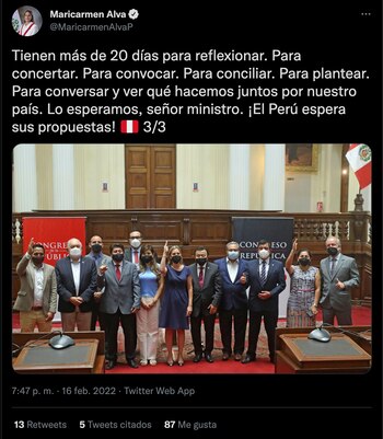 Finalizó recordando la reunión que tienen con el premier para dar el voto de confianza. “Tienen más de 20 días para reflexionar. Para concertar. Para convocar. Para conciliar. Para plantear. Para conversar y ver qué hacemos juntos por nuestro país. Lo esperamos, señor ministro. ¡El Perú espera sus propuestas! 🇵🇪 “, finalizó.