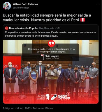 Otro accionpopulista muestra su apoyo ante la decisión de Alva. “Buscar la estabilidad siempre será la mejor salida a cualquier crisis. Nuestra prioridad es el Perú 🇵🇪”, comentó.