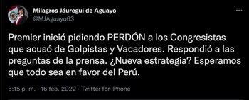“Premier inició pidiendo PERDÓN a los Congresistas que acusó de Golpistas y Vacadores. Respondió a las preguntas de la prensa. ¿Nueva estrategia? Esperamos que todo sea en favor del Perú”, añadió