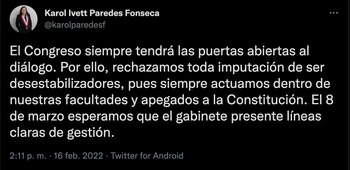 La congresista de Acción Popular, hizo un llamado al Gabinete Torres a conversar con ellos. “El Congreso siempre tendrá las puertas abiertas al diálogo. Por ello, rechazamos toda imputación de ser desestabilizadores, pues siempre actuamos dentro de nuestras facultades y apegados a la Constitución. El 8 de marzo esperamos que el gabinete presente líneas claras de gestión”, se lee.