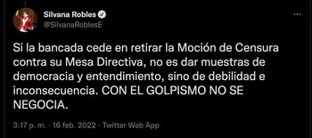 “Si la bancada cede en retirar la Moción de Censura contra su Mesa Directiva, no es dar muestras de democracia y entendimiento, sino de debilidad e inconsecuencia. CON EL GOLPISMO NO SE NEGOCIA”, finalizó.