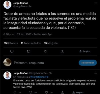 “Dotar de armas no letales a los serenos es una medida facilista y efectista que no resuelve el problema real de la inseguridad ciudadana y que, por el contrario, acrecentaría la escalada de violencia”, así lo mencionó a través de su cuenta oficial de Twitter.