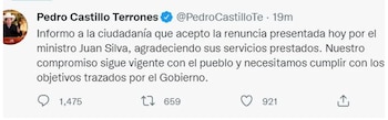 Horas después, Castillo aceptó su renuncia a través de su cuenta oficial de Twitter.