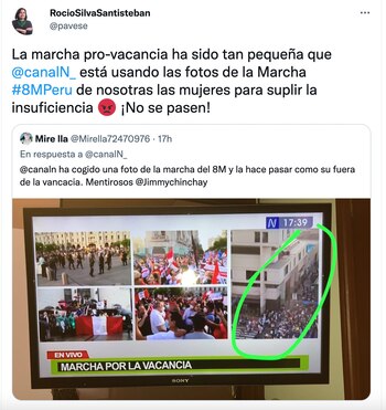 “La marcha pro-vacancia ha sido tan pequeña que @canalN_ está usando las fotos de la Marcha #8MPeru de nosotras las mujeres para suplir la insuficiencia 😡 ¡No se pasen!”.