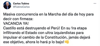 “Masiva concurrencia en la Marcha del día de hoy para decir con firmeza: VACANCIA YA! Castillo está destruyendo el Perú! En su 1ra etapa infiltrando el Estado con ultra izquierdistas para impulsar el cambio de la Constitución, jamás dejará ese objetivo, ahora lo hará p lo bajo!👊”