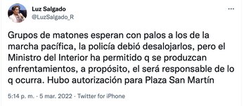 “Grupos de matones esperan con palos a los de la marcha pacífica, la policía debió desalojarlos, pero el Ministro del Interior ha permitido q se produzcan enfrentamientos, a propósito, el será responsable de lo q ocurra. Hubo autorización para Plaza San Martín”.