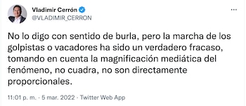 “No lo digo con sentido de burla, pero la marcha de los golpistas o vacadores ha sido un verdadero fracaso, tomando en cuenta la magnificación mediática del fenómeno, no cuadra, no son directamente proporcionales”.