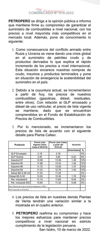 PetroPerú anunció que desde hoy se producirá un alza sustancial en el precio de los combustible a consecuencia de la invasión de Rusia a Ucrania que ha provocado “el rápido incremento de los precios a nivel internacional” y que “encarece nuestras compras de crudo, insumos y productos terminados y pone en situación de emergencia la sostenibilidad del suministro en el país”.