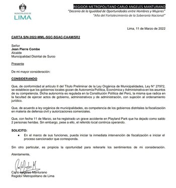 “Tras lamentable accidente en Play Land Park, he solicitado al alcalde Jean Pierre Combe de la Municipalidad de Surco, inmediata intervención de fiscalización y que se inicie proceso sancionador. Un establecimiento que NO garantiza seguridad a sus usuarios, NO debe continuar operando”, escribió el regidor de la comuna limeña adjuntando la carta que le envió al burgomaestre.