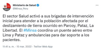 “Grupo de intervención rápida para Emergencias y desastres del INDECI, liderados por el ministro (de Defensa) y nuestro jefe institucional, Carlos Yañez, se dirigen a la zona de la emergencia en el distrito de Parcoy, provincia de Pataz, región de La Libertad, para coordinar acciones de respuesta y ayuda inmediata a los afectados por deslizamiento, según lo dispuesto por (la Presidencia de la República)”, informó en un hilo de Twitter.