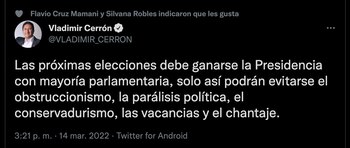 “Las próximas elecciones debe ganarse la Presidencia con mayoría parlamentaria, solo así podrán evitarse el obstruccionismo, la parálisis política, el conservadurismo, las vacancias y el chantaje”, se lee en su tuit.