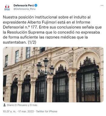 “Nuestra posición institucional sobre el indulto al expresidente Alberto Fujimori está en el Informe Defensorial n.° 177. Entre sus conclusiones señala que la Resolución Suprema que lo concedió no expresaba de forma suficiente las razones médicas que la sustentaban”, señalaron en un tuit.