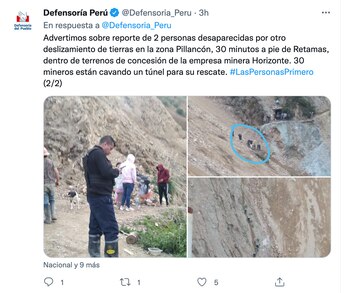 “Advertimos sobre reporte de 2 personas desaparecidas por otro deslizamiento de tierras en la zona Pillancón, 30 minutos a pie de Retamas, dentro de terrenos de concesión de la empresa minera Horizonte. 30 mineros están cavando un túnel para su rescate. #LasPersonasPrimero”, se lee en la publicación.