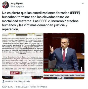 La exministra de salud y parlamentaria de Perú Libre, Katy Ugarte, se pronunció acerca de las esterilizaciones forzadas, tema que salió a la luz en el debate de la interpelación al ministro de Salud, Hernán Condori. Ugarte aseguró que las esterilizaciones forzadas no buscaban buscaban terminar con las elevadas tasas de mortalidad materna.