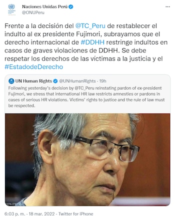 “Tras la decisión de ayer del Tribunal Constitucional del Perú de restablecer el indulto al expresidente Fujimori, subrayamos que el derecho internacional de derechos humanos restringe amnistías o indultos en casos de graves violaciones de derechos humanos. Se debe respetar los derechos de las víctimas a la justicia y el estado de derecho”, fue el pronunciamiento de la oficina del Alto Comisionado para los Derechos Humanos de la Organización de las Naciones Unidas (ONU).