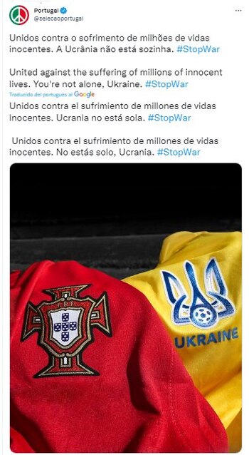- La selección de Portugal le rinde homenaje a Ucrania que enfrenta la invasión rusa en su territorio. “Unidos contra el sufrimiento de millones de vidas inocentes. Ucrania no está sola. #StopWar”
