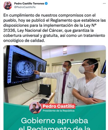 “En cumplimiento de nuestros compromisos con el pueblo, hoy se publicó el Reglamento que establece las disposiciones para la implementación de la Ley N° 31336, Ley Nacional del Cáncer, que garantiza la cobertura universal y gratuita, así como un tratamiento oncológico de calidad”, se lee en su Twitter.