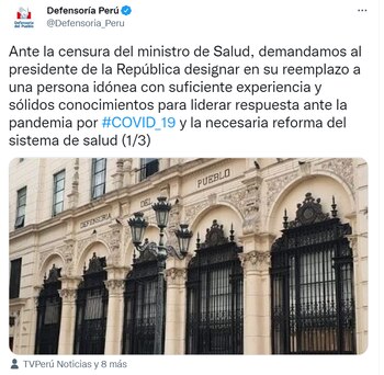 La Defensoría del Pueblo exigió al presidente Pedro Castillo a que designe a una “personas idónea” en el Ministerio de Salud (Minsa), luego de la censura de su titular, Hernán Condori, este jueves 31 de marzo por el Congreso de la República.