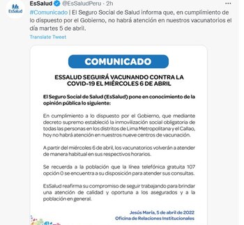 De un modo similar, Seguro Social de Salud (EsSalud) informó que no habrá atención en sus nueve centros de vacunación habilitados en Lima Metropolitana y el Callao.