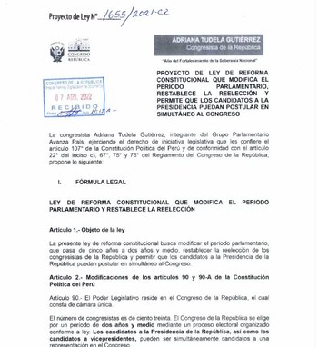 La congresista de Avanza País Adriana Tudela presentó un proyecto de ley de reforma constitucional para modificar el periodo parlamentario y que así se permita la reelección de los legisladores, la cual fue eliminada oficialmente en 2020.
