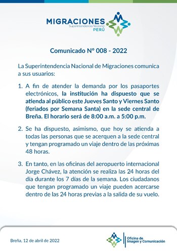 “A fin de atender la demanda por los pasaportes electrónicos, la institución ha dispuesto que se atienda al público este Jueves Santo y Viernes Santo (feriados por Semana Santa) en la sede central de Breña. El horario será de 8:00 a.m.a 5:00 p.m.”, señalaron en un comunicado por redes sociales.