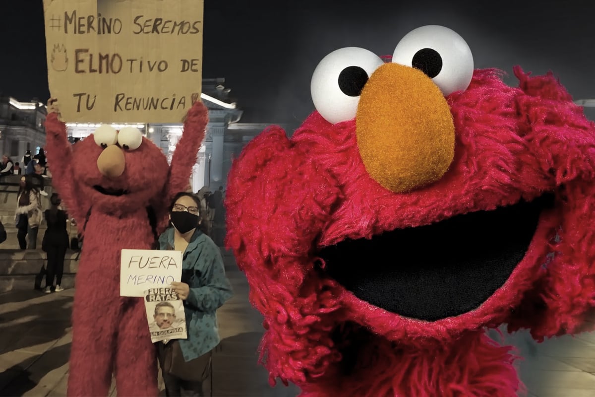 Un video registrado y compartido en las redes sociales nos mostró a un joven con el disfraz de Elmo formando parte de los grupos que salieron a las calles para exigir la renuncia de Merino. En esta grabación se logra verlo con un cartel en las manos mientras de fondo se escuchaba la curiosa frase.