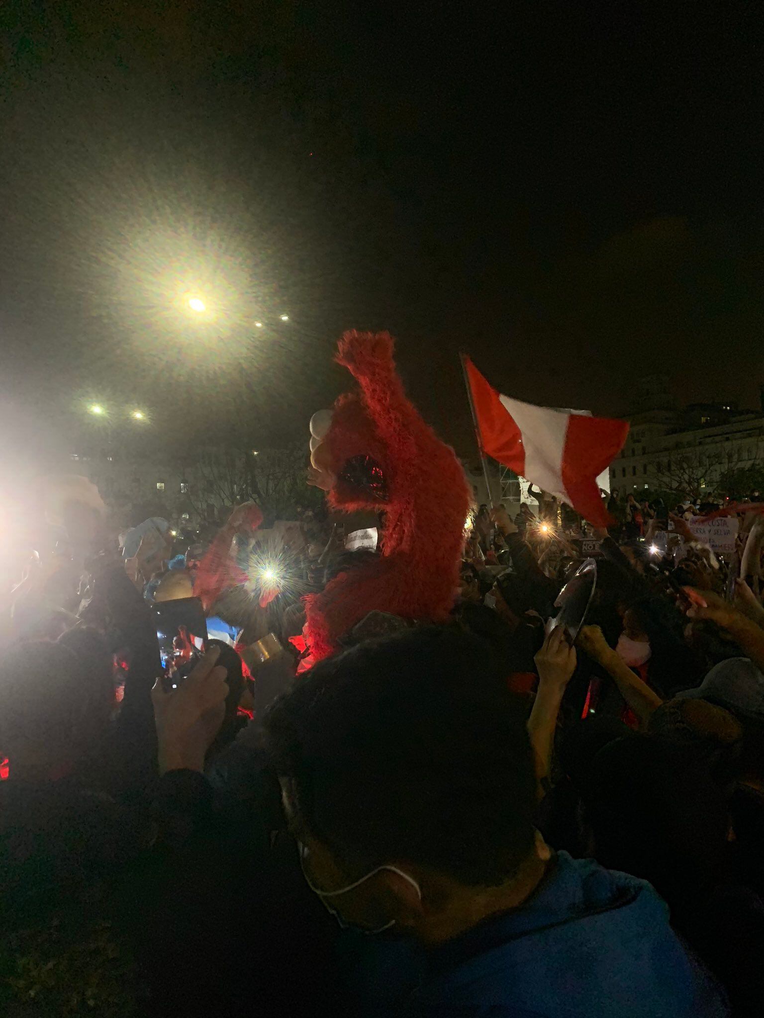 “Sí, yo soy el que está vestido de Elmo y el chico de la Bandera, es mi ahora amigo Hugo; un perfecto extraño al que conocí el día de la protesta. Nos hicimos “patas” cuando me aventuré delante de Palacio y me dijo: ¡Toma La Bandera!, luego de ondearla en medio de vítores y gritos frente a la multitud, cual partido de fútbol, nos dirigimos a la Plaza San Martin. Avanzamos hasta donde pudimos porque el gas ya nos había tocado dos veces en días anteriores, además cuando corres con un disfraz es doblemente difícil moverte, aún con zapatillas. Relato aquí como este perfecto extraño me acompañó ese día, me cuidó y me pasaba la voz con un grito o me tocaba la espalda ubicándome hacia donde correr si escuchábamos explosiones, un perfecto extraño ese día fue mi hermano”.