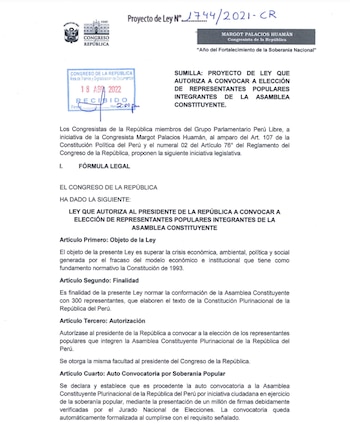 La bancada de Perú Libre presentó un proyecto de ley para permitir que el presidente de la República pueda convocar a elección de una Asamblea Constituyente para elaborar una nueva Constitución.