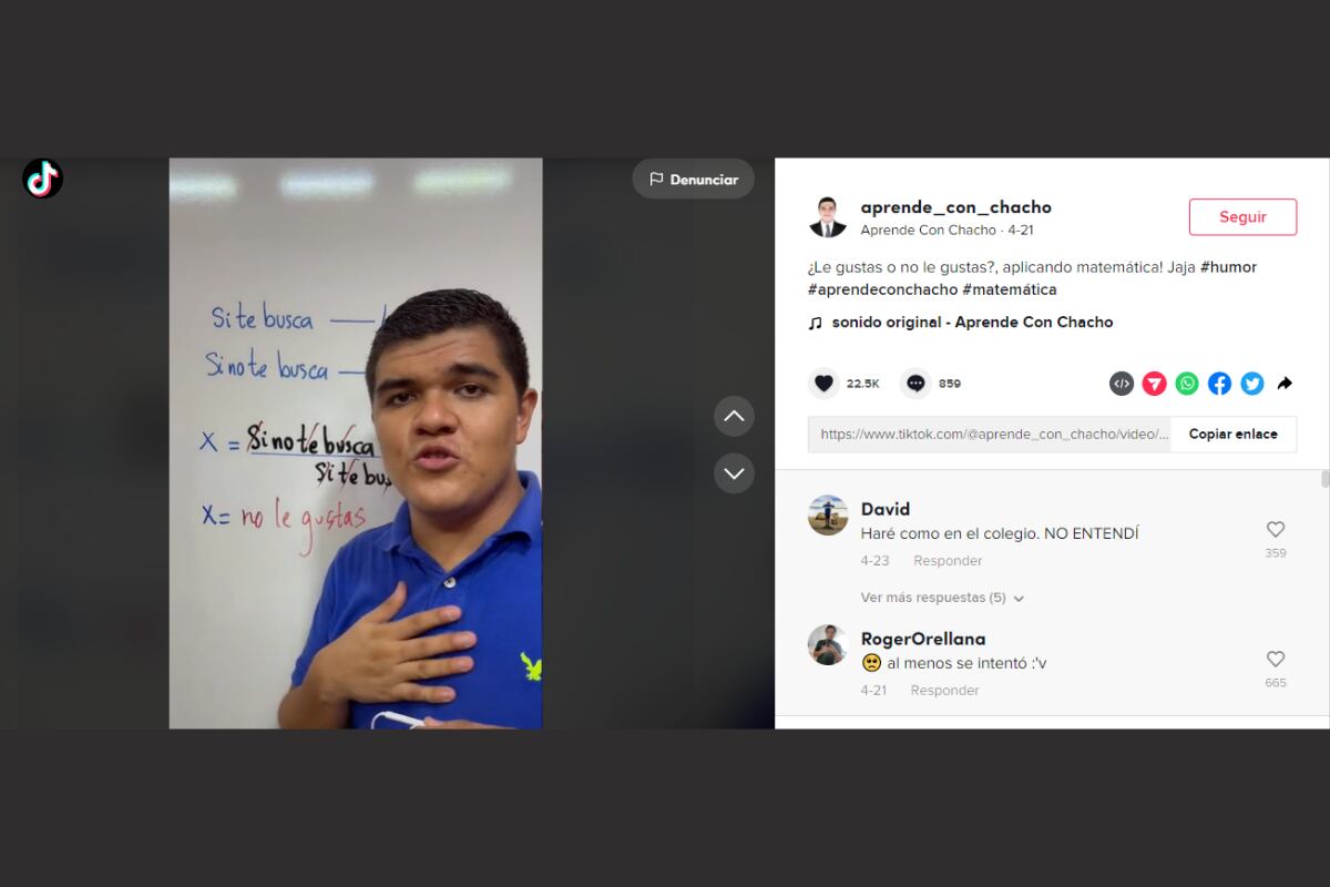 El tiktoker con la cuenta @aprende_con_chacho muestra el paso a paso que debes realizar para poder descubrir si hay interés de esa persona que ha llamado tu atención. Este ingeniero de profesión usó este tema para usarlo como ejemplo en sus clases por Tiktok.